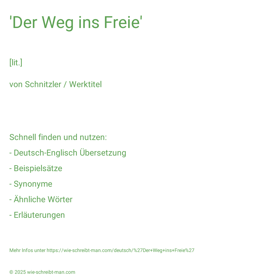 Du möchtest andere auf die richtige Schreibweise von 'Der Weg ins Freie' hinweisen? Hier kannst du passende Bilder zu "'Der Weg ins Freie'" direkt auf Social Media teilen. Klicke dazu einfach bei dem jeweiligen Bild auf und wähle die gewünschte Variante bzw. Social Media Plattform aus.