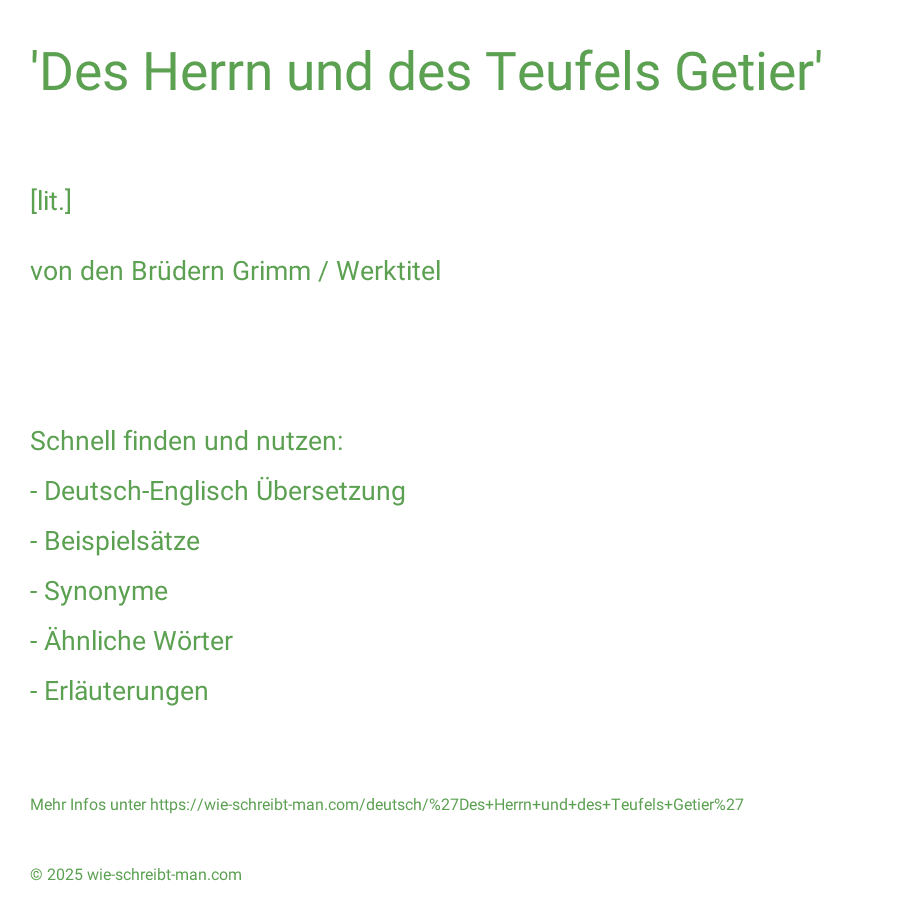 Du möchtest andere auf die richtige Schreibweise von 'Des Herrn und des Teufels Getier' hinweisen? Hier kannst du passende Bilder zu "'Des Herrn und des Teufels Getier'" direkt auf Social Media teilen. Klicke dazu einfach bei dem jeweiligen Bild auf und wähle die gewünschte Variante bzw. Social Media Plattform aus.