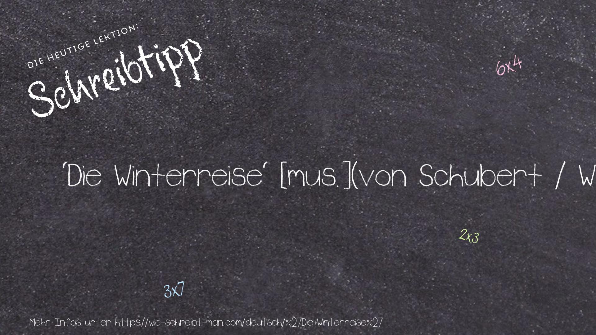Du möchtest andere auf die richtige Schreibweise von 'Die Winterreise' hinweisen? Hier kannst du passende Bilder zu "'Die Winterreise'" direkt auf Social Media teilen. Klicke dazu einfach bei dem jeweiligen Bild auf und wähle die gewünschte Variante bzw. Social Media Plattform aus.