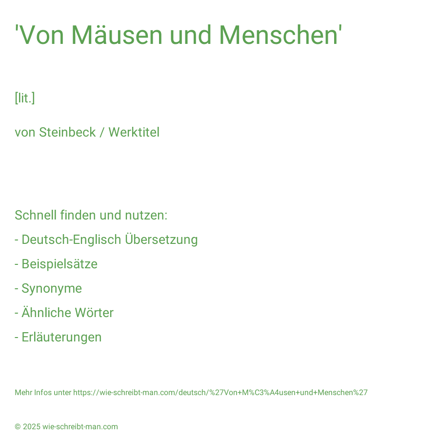 Du möchtest andere auf die richtige Schreibweise von 'Von Mäusen und Menschen' hinweisen? Hier kannst du passende Bilder zu "'Von Mäusen und Menschen'" direkt auf Social Media teilen. Klicke dazu einfach bei dem jeweiligen Bild auf und wähle die gewünschte Variante bzw. Social Media Plattform aus.